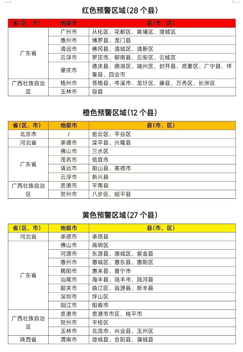 預(yù)計(jì),8月4日20時(shí)至8月5日20時(shí),北京東北部、河北北部、廣東中部和西部、廣西東部等地部分地區(qū)發(fā)生山洪災(zāi)害可能性大(橙色預(yù)警),其中,廣東中部和西部、廣西東部局地發(fā)生山洪災(zāi)害可能性很大(紅色預(yù)警),預(yù)警區(qū)域涉及的縣(市、區(qū))見下表。其他地區(qū)也可能因局地短歷時(shí)強(qiáng)降水引發(fā)山洪災(zāi)害,請(qǐng)各地注意做好實(shí)時(shí)監(jiān)測(cè)、防汛預(yù)警和轉(zhuǎn)移避險(xiǎn)等防范工作。