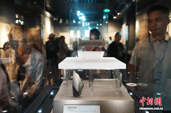 8月6日,河南安陽,參加“穿越古今 漢你相‘豫’”河南古都創(chuàng)享之旅的數(shù)十位臺灣網(wǎng)絡達人、自媒體從業(yè)者等在中國文字博物館尋找漢字根源。圖為臺灣網(wǎng)絡達人欣賞戰(zhàn)國陶片。中新社記者 闞力 攝