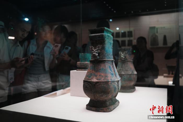 8月6日,河南安陽,參加“穿越古今 漢你相‘豫’”河南古都創(chuàng)享之旅的數(shù)十位臺灣網(wǎng)絡達人、自媒體從業(yè)者等在中國文字博物館尋找漢字根源。圖為西周賈伯壺吸引臺灣網(wǎng)絡達人圍觀。中新社記者 闞力 攝