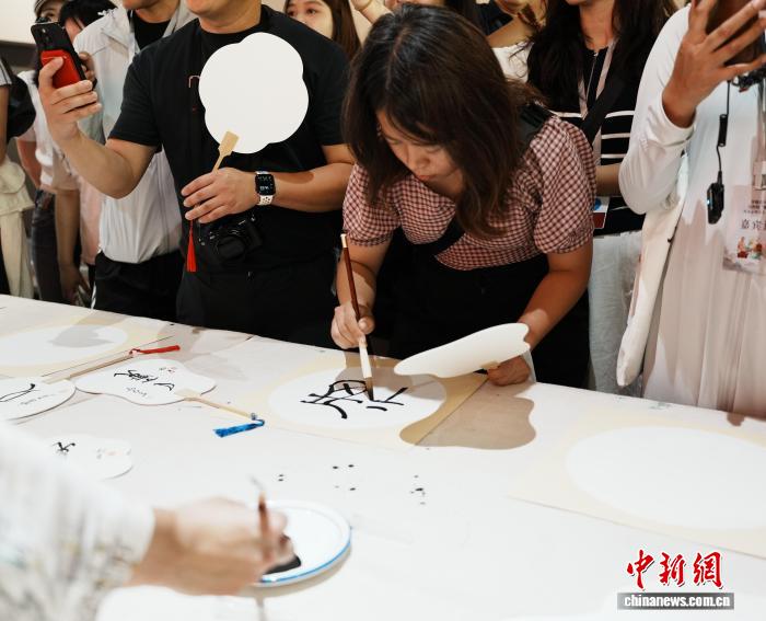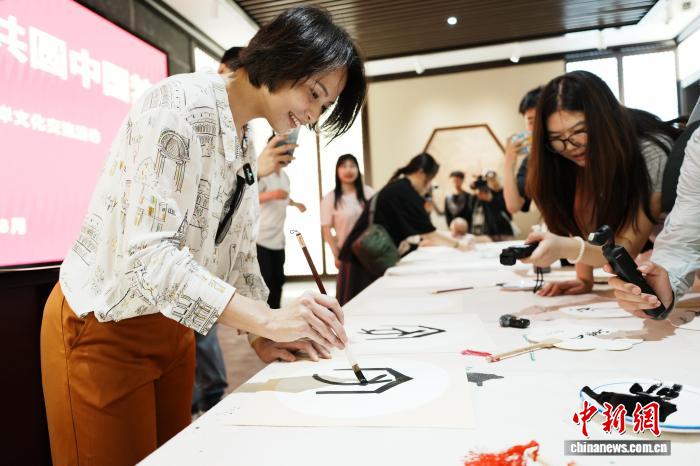 8月6日,河南安陽,參加“穿越古今 漢你相‘豫’”河南古都創(chuàng)享之旅的數(shù)十位臺灣網(wǎng)絡達人、自媒體從業(yè)者等在中國文字博物館尋找漢字根源。圖為臺灣網(wǎng)絡達人嘗試書寫甲骨文。中新社記者 闞力 攝