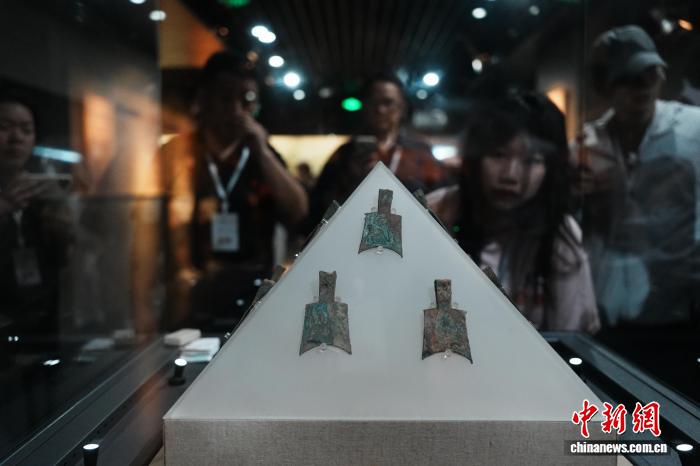 8月6日,河南安陽,參加“穿越古今 漢你相‘豫’”河南古都創(chuàng)享之旅的數(shù)十位臺灣網(wǎng)絡達人、自媒體從業(yè)者等在中國文字博物館尋找漢字根源。圖為臺灣網(wǎng)絡達人圍觀館藏戰(zhàn)國布幣。中新社記者 闞力 攝