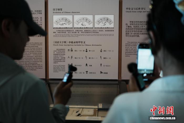 8月6日,河南安陽,參加“穿越古今 漢你相‘豫’”河南古都創(chuàng)享之旅的數(shù)十位臺灣網(wǎng)絡達人、自媒體從業(yè)者等在中國文字博物館尋找漢字根源。圖為臺灣網(wǎng)絡達人欣賞甲骨文。中新社記者 闞力 攝