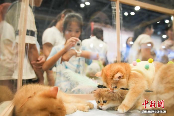8月9日,正在廣西南寧國際會展中心舉行的寵物展吸引不少參觀者。圖為兒童用電話手表拍攝貓咪。中新社記者 陳冠言 攝