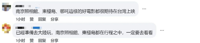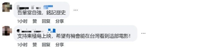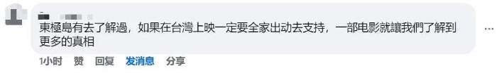 “銘記歷史,吾輩當自強!”有臺灣網(wǎng)友在“看臺?!奔跋嚓P(guān)境外平臺留言表示,正準備到大陸旅行,計劃在大陸觀看《東極島》。更多臺灣網(wǎng)友呼吁《東極島》等大陸優(yōu)秀抗戰(zhàn)電影能盡早在臺灣地區(qū)上映,屆時“一定要全家出動支持”。