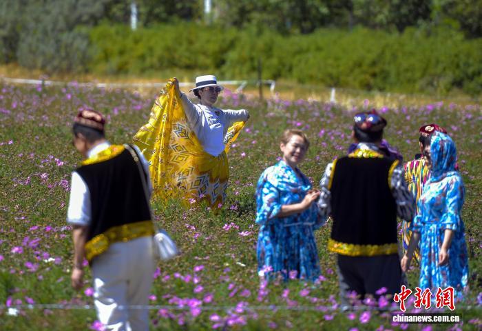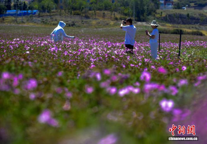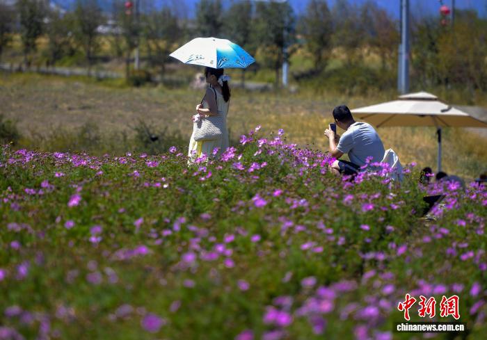 8月12日,在天山腳下的新疆烏魯木齊縣平西梁村,大片格桑花迎來盛花期,綿延的花海吸引眾多游客前來游玩,漫步花田間拍照打卡。中新社記者 劉新 攝