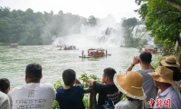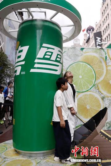 8月24日,游客在南京東路步行街上的噴霧降溫裝置下避暑。中新社記者 殷立勤 攝