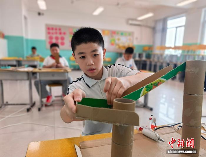 圖為武強(qiáng)縣中小學(xué)科學(xué)運(yùn)動(dòng)會(huì)紙橋承重賽,參賽選手正在測(cè)試紙橋承受力。王天祥 攝