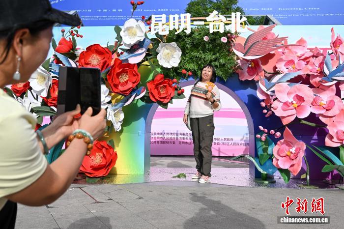 8月27日,市民與鵲橋造型的花藝作品合影。中新社記者 李嘉嫻 攝
