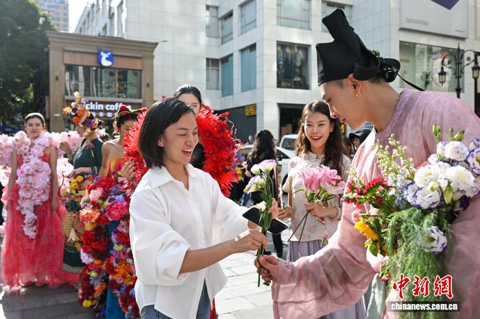 8月27日,工作人員為市民贈(zèng)送鮮花。中新社記者 李嘉嫻 攝