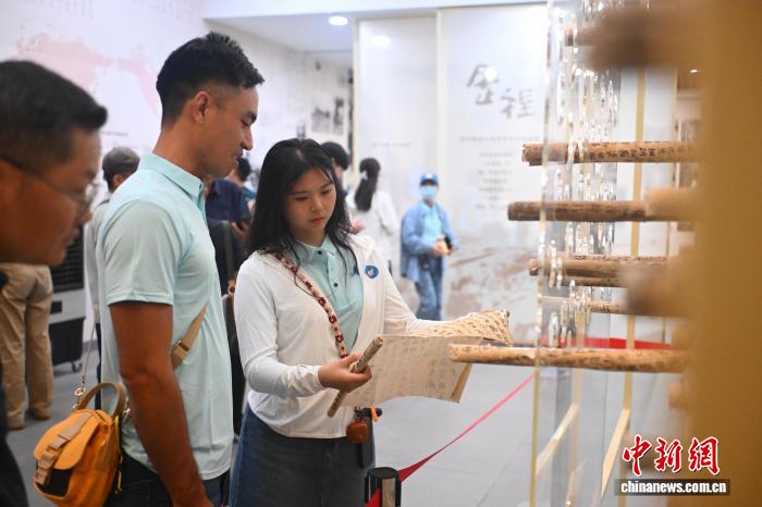 圖為活動(dòng)嘉賓參觀敦煌文獻(xiàn)復(fù)制品。中新社記者 李亞龍 攝