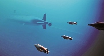 “灰鯊”自主水下航行器配合潛艇開展集群行動效果圖。