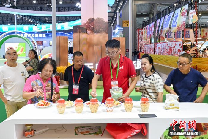 圖為四川農(nóng)博會上,來自眉山的“東坡泡菜”吸引參觀者駐足或品嘗。中新社記者 劉忠俊 攝
