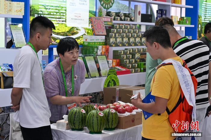圖為甘孜州的高原西瓜等農(nóng)特產(chǎn)品吸引參觀者駐足。中新社記者 劉忠俊 攝