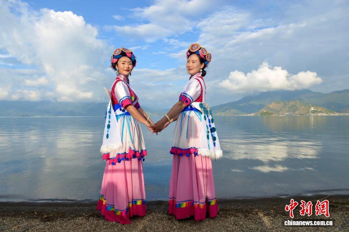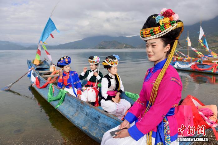 圖為瀘沽湖邊身穿民族服飾的摩梭人。鄭健 攝