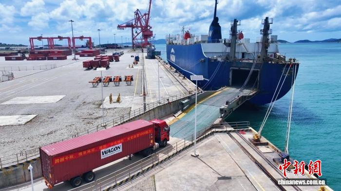 據(jù)統(tǒng)計(jì),“臺北快輪”總噸位18080噸,一次最大可載運(yùn)230個(gè)標(biāo)準(zhǔn)集裝箱,采用集裝箱連車架一同運(yùn)輸?shù)姆绞剑d運(yùn)跨境電商貨物、快件、小貿(mào)市場貨物以及一般貿(mào)易貨物,為目前入境平潭港最大噸位貨物滾裝船。