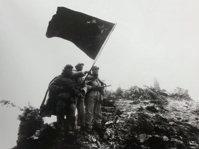 1954年夏天,袁國祥隨藏北運輸指揮所的駱駝隊穿越海拔5000多米的桑株達坂到達阿里普蘭,在海拔5200多米的邊界山口,拍下3個戰(zhàn)士高舉紅旗、手握鋼槍的畫面,留下五星紅旗飄揚在阿里高原的寶貴歷史鏡頭。這也就是大家熟知的作品《紅旗插上喜馬拉雅》。