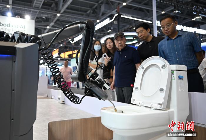9月26日,智能清潔機器人展示清理馬桶。近日,第四屆全球數(shù)字貿易博覽會在浙江杭州舉行,大量的AI應用、機器人應用亮相展覽現(xiàn)場,先進科技吸引民眾。中新社記者 王剛 攝