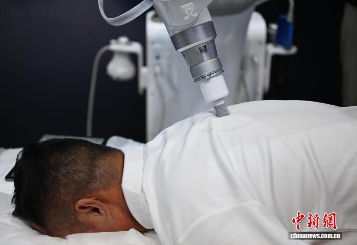 9月26日,中醫(yī)按摩機器人為參觀者按摩。近日,第四屆全球數(shù)字貿易博覽會在浙江杭州舉行,大量的AI應用、機器人應用亮相展覽現(xiàn)場,先進科技吸引民眾。中新社記者 王剛 攝