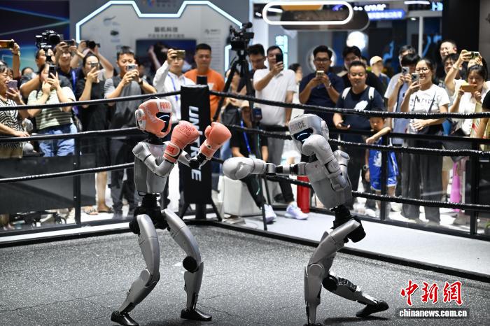 9月26日,宇樹機器人拳擊比賽吸引參觀者。近日,第四屆全球數(shù)字貿易博覽會在浙江杭州舉行,大量的AI應用、機器人應用亮相展覽現(xiàn)場,先進科技吸引民眾。中新社記者 王剛 攝