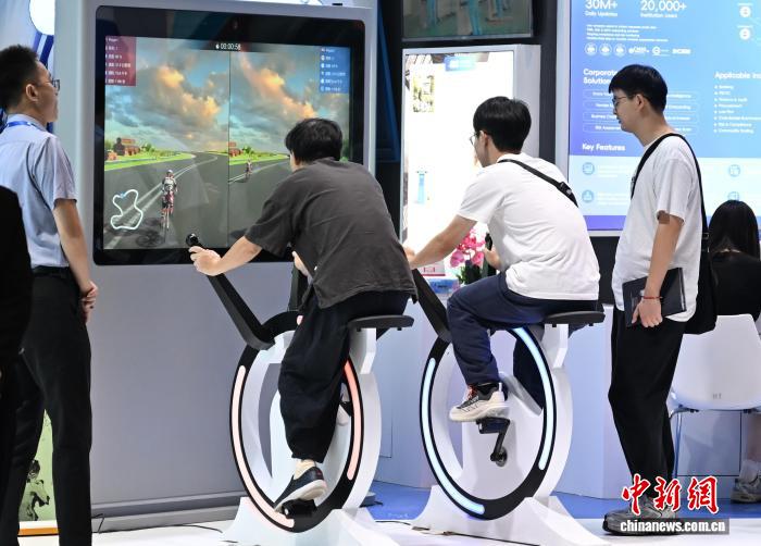 9月26日,參觀者體驗AI騎行。近日,第四屆全球數(shù)字貿易博覽會在浙江杭州舉行,大量的AI應用、機器人應用亮相展覽現(xiàn)場,先進科技吸引民眾。中新社記者 王剛 攝
