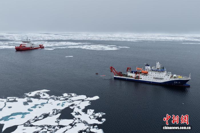 在“雪龍2”號(hào)船的保障支持下,“深海一號(hào)”船搭載“蛟龍”號(hào)在北極冰區(qū)作業(yè)。(自然資源部供圖)