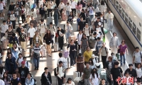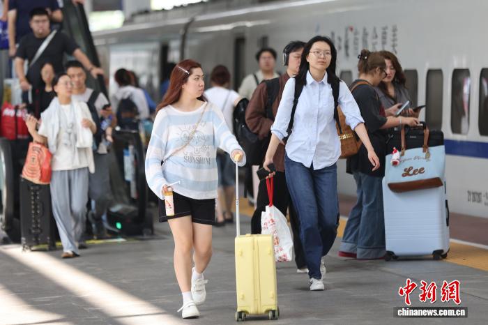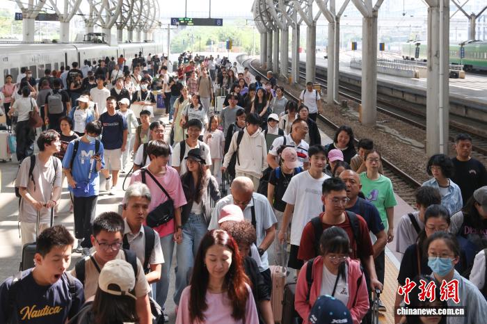 10月8日,江蘇南京,旅客們在火車站出行。當日是國慶中秋假期最后一天,長三角鐵路迎來返程客流最高峰。中新社記者 泱波 攝