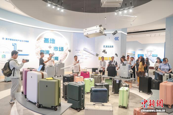 10月14日,江西吉安, 兩岸新媒體人在新干箱包皮具產(chǎn)業(yè)園的展示區(qū)參觀。新干縣是全國四大箱包皮具產(chǎn)業(yè)基地之一,擁有615家箱包皮具生產(chǎn)企業(yè)和箱包生產(chǎn)的全產(chǎn)業(yè)鏈,年產(chǎn)箱包超5500萬只。10月13日至14日,2025“媒眼贛鄱·風景獨好” 兩岸新媒體交流活動一行來到江西吉安市,先后前往了能仁巷歷史文化街區(qū)、白鷺洲書院、釣源古村、新干箱包皮具產(chǎn)業(yè)園、大洋洲商代青銅博物館等地參觀采風,實地感知廬陵文化的獨特魅力和社會經(jīng)濟發(fā)展成就。中新社記者 劉力鑫 攝