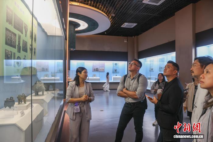 10月14日,江西吉安, 兩岸新媒體人在新干縣的大洋洲商代青銅博物館參觀,感受古老神秘的青銅文化魅力。新干商代大墓共出土青銅器475件,玉器754件,陶器139件,其中五件文物被定為國寶級文物。該墓的考古發(fā)掘被評為“七五”期間全國十大考古發(fā)現(xiàn)之一,新干因此被譽為“江南青銅王國”。10月13日至14日,2025“媒眼贛鄱·風景獨好” 兩岸新媒體交流活動一行來到江西吉安市,先后前往了能仁巷歷史文化街區(qū)、白鷺洲書院、釣源古村、新干箱包皮具產(chǎn)業(yè)園、大洋洲商代青銅博物館等地參觀采風,實地感知廬陵文化的獨特魅力和社會經(jīng)濟發(fā)展成就。(無人機照片)中新社記者 劉力鑫 攝