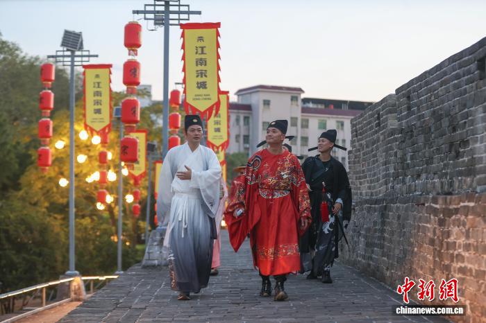 10月15日,江西贛州,兩岸新媒體人身著古裝,在宋代古城墻上參觀游覽,該城墻全長約3.6公里,是國內(nèi)保留最完整的宋代磚城墻。中新社記者 劉力鑫 攝