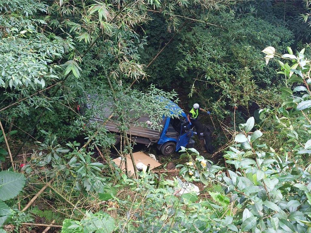 新北市坪林苦苓腳山區(qū)小貨車(chē)翻落山坡。(新北市消防局提供)