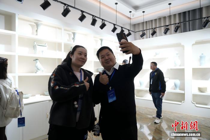 10月19日,河南平頂山汝州,參加“中國(guó)式現(xiàn)代化發(fā)展看河南”2025兩岸媒體聯(lián)合采訪活動(dòng)的數(shù)十位媒體人、自媒體從業(yè)者等走進(jìn)中國(guó)汝瓷博物館和汝瓷生產(chǎn)企業(yè),感受千年汝瓷文化。圖為臺(tái)灣自媒體從業(yè)者欣賞汝瓷。王佳寧 攝