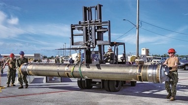 美軍人員準備將“戰(zhàn)斧”巡航導彈裝載至潛艇上。