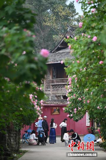 10月28日,在四川省成都市明蜀王陵墻外,盛開的芙蓉花與紅墻黛瓦相互映襯,吸引不少市民前來打卡這一古風(fēng)古韻景觀。中新社記者 張浪 攝