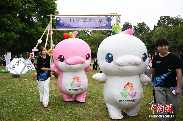 11月1日,第3屆粵港澳大灣區(qū)大學(xué)生電影周暨第21屆廣州大學(xué)生電影展“晚風(fēng)FUN映”電影之夜在位于廣州市的華南農(nóng)業(yè)大學(xué)舉辦。圖為活動(dòng)現(xiàn)場(chǎng)的十五運(yùn)會(huì)和殘?zhí)貖W會(huì)吉祥物“喜洋洋”“樂(lè)融融”。中新社記者 陳楚紅 攝
