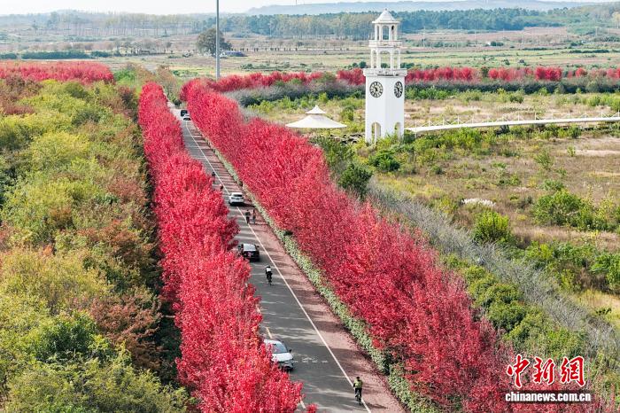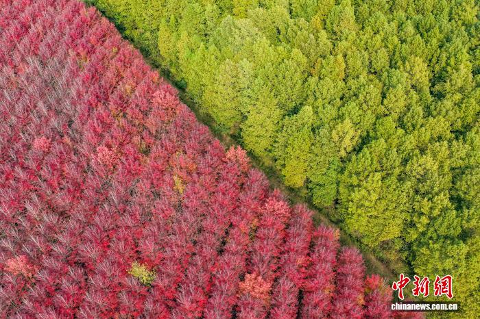 11月3日,江蘇南京,大泉湖畔鄉(xiāng)村公路兩旁楓葉如霞似火,放眼望去,美景如畫(huà)。(無(wú)人機(jī)照片)中新社記者 泱波 攝