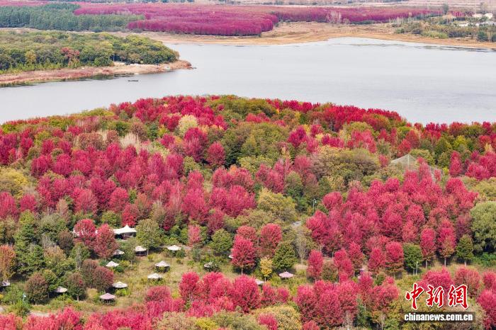 11月3日,江蘇南京,大泉湖畔楓葉如霞似火,放眼望去,美景如畫(huà)。(無(wú)人機(jī)照片)中新社記者 泱波 攝