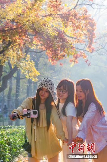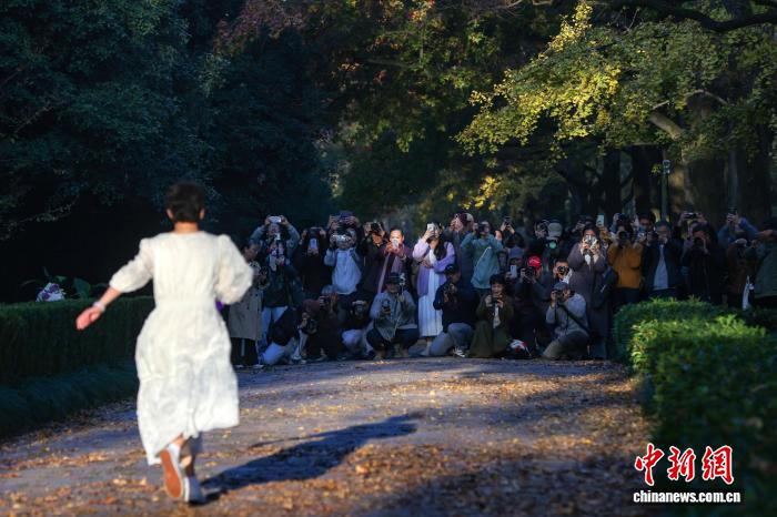 11月12日清晨,年輕人走進世界文化遺產(chǎn)南京明孝陵,在有著六百多年歷史的石象路上拍攝照片,在光影中盡享濃濃秋意。中新社記者 泱波 攝