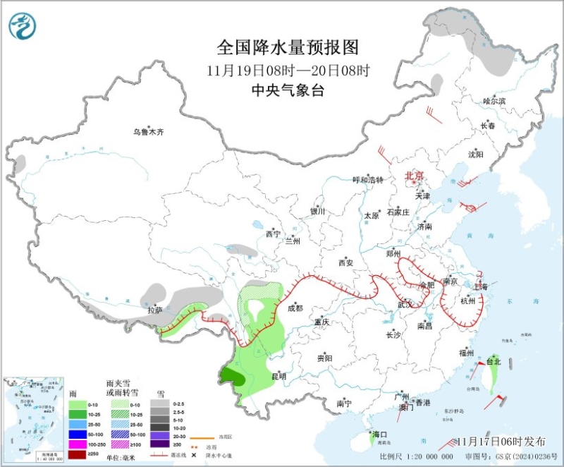11月17日08時至18日08時,內(nèi)蒙古東北部、黑龍江東部、吉林東部、河南西南部、陜西東南部、湖北西北部等地部分地區(qū)有小到中雪或雨夾雪,其中,陜西東南部、湖北西北部等地局地有大雪(5~9毫米);江淮西部、江漢、江南北部和西部、西南地區(qū)東部和南部、華南北部和西部等地部分地區(qū)有小到中雨。新疆北部、甘肅北部、青海東部和南部、內(nèi)蒙古中東部、黑龍江東部、華北北部、遼東半島、山東半島、江漢東部、湖南北部、江西北部、浙閩東部沿海等地的部分地區(qū)有5~6級風(fēng)、陣風(fēng)7~9級;渤海、渤海海峽有7級風(fēng)、陣風(fēng)8級,黃海大部、東海大部、臺灣海峽、臺灣以東洋面、南海北部和中部、北部灣有7~8級風(fēng)、陣風(fēng)9~10級,其中,東海南部、臺灣海峽的部分海域風(fēng)力可達(dá)9級、陣風(fēng)10~11級。