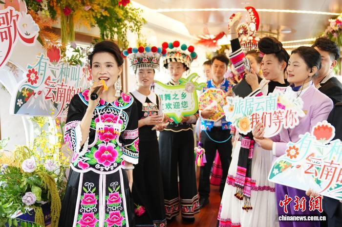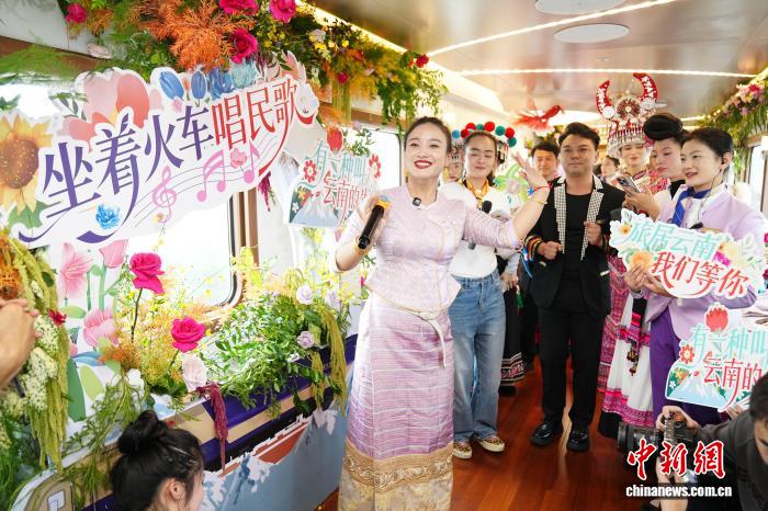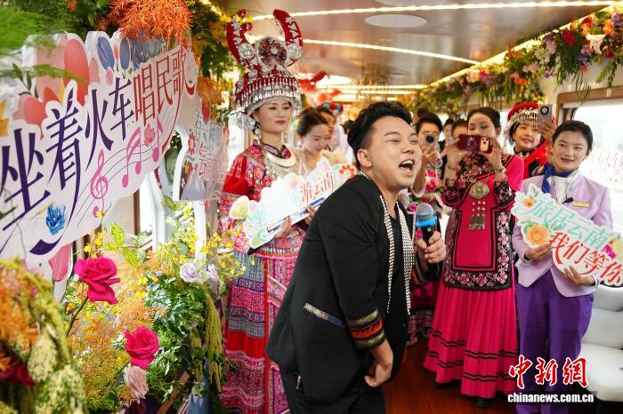 11月18日,由云南省文化和旅游廳、國鐵昆明局、紅河州人民政府聯(lián)合開展的“坐著火車唱民歌”文旅主題推廣正式啟動(dòng),來自昆明、紅河、文山、普洱、玉溪、大理、楚雄、西雙版納等州市的歌手,在“星光·瀾湄號(hào)”列車上,通過“一首民歌、一位歌手、一個(gè)推介”的方式,向公眾推薦“坐著火車游云南”精品線路和特色旅居目的地。中新社記者 劉冉陽 攝