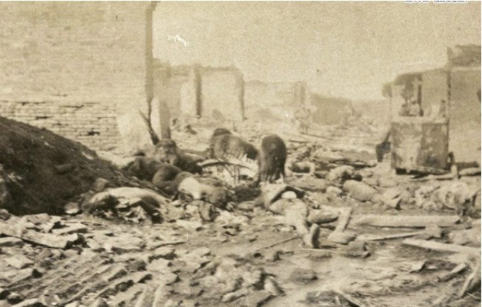1895年甲午戰(zhàn)爭(zhēng),田莊臺(tái)之戰(zhàn)。戰(zhàn)火破壞的遺跡和遺體。圖源:中國(guó)軍網(wǎng)