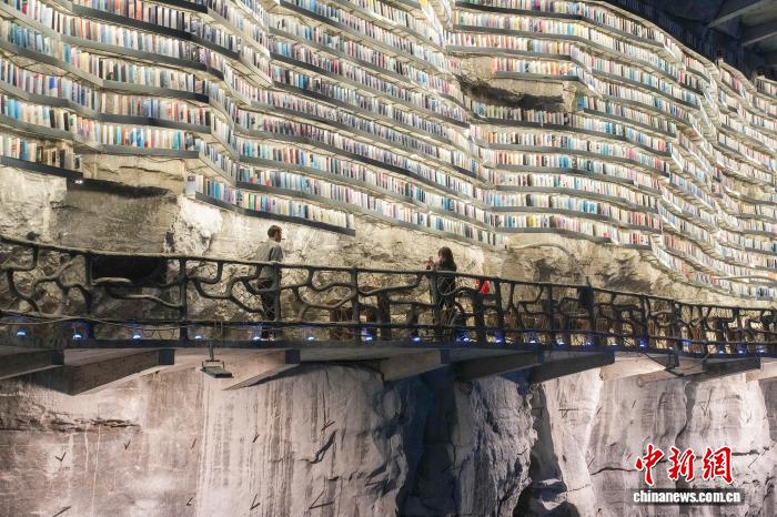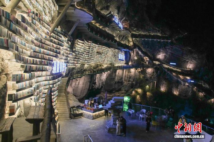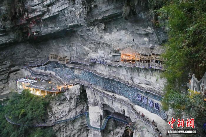 11月20日,廣西河池市羅城仫佬族自治縣棉花村深洞屯棉花天坑旅游度假區(qū),不少游客專程前來“打卡”網(wǎng)紅懸崖書店。該書店在“天坑”中沿崖壁而建,在不破壞原有地貌的前提下與自然景觀深度融合,為游客提供藝術(shù)空間和奶茶、咖啡等主題消費場景。從今年5月開業(yè)至今,累計接待游客超10萬人次。中新社記者 陳冠言 攝