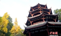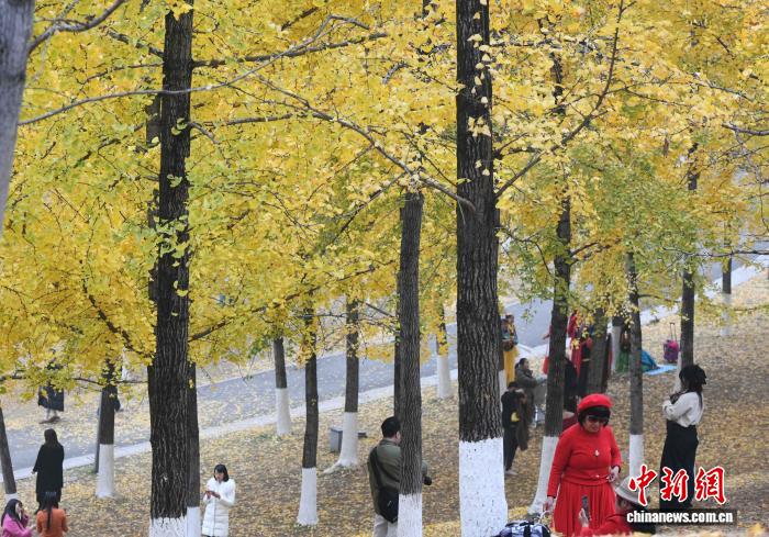 12月2日,重慶中央公園內(nèi)的大面積銀杏葉金黃滿枝,吸引民眾前往欣賞。圖為市民在銀杏林下拍照留影。中新社記者 周毅 攝