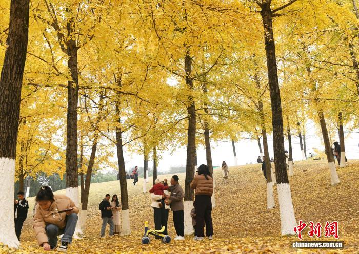 12月2日,重慶中央公園內(nèi)的大面積銀杏葉金黃滿枝,吸引民眾前往欣賞。圖為市民在銀杏林下游玩。中新社記者 周毅 攝