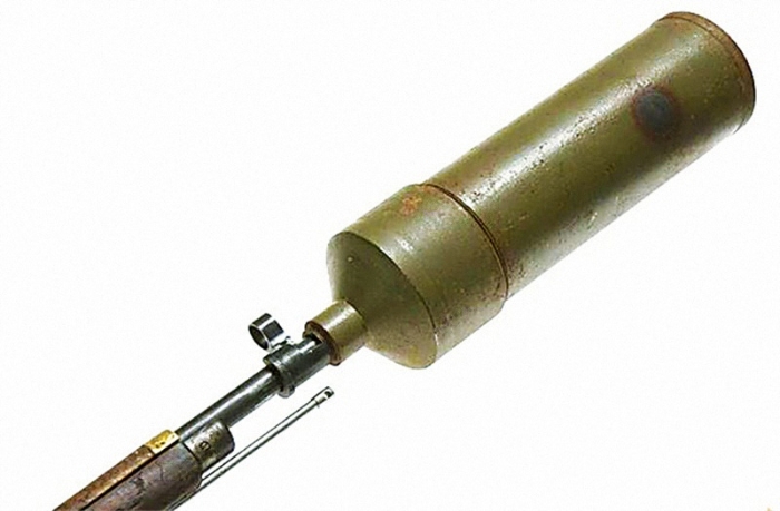 楚克曼拋瓶器的設(shè)計原理比較簡單,即以步槍發(fā)射空包彈產(chǎn)生的火藥燃氣作為動力,將燃燒瓶拋射出去。其外觀是一個較大的金屬圓筒,可以像裝消聲器那樣,通過一個卡口機構(gòu)快速安裝在莫辛-納甘步槍槍口上。發(fā)射時,士兵先將一個特制的木質(zhì)墊板放入金屬圓筒底部,然后將燃燒瓶裝入。這塊木質(zhì)墊板看似不起眼,卻很關(guān)鍵,能防止玻璃瓶在發(fā)射管內(nèi)因瞬間受力過大而提前碎裂。