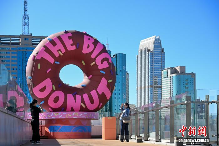 12月4日,市民在“瘋狂動物城”超大甜甜圈裝置前拍照留念。中新社記者 李嘉嫻 攝