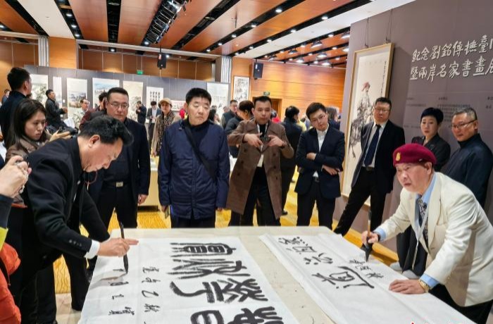 12月9日,“紀(jì)念劉銘傳撫臺(tái)140周年兩岸交流活動(dòng)暨兩岸名家書畫展”在北京臺(tái)灣會(huì)館開幕。圖為參與活動(dòng)的兩岸嘉賓現(xiàn)場(chǎng)揮毫。中新社記者劉大煒 攝