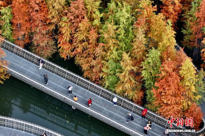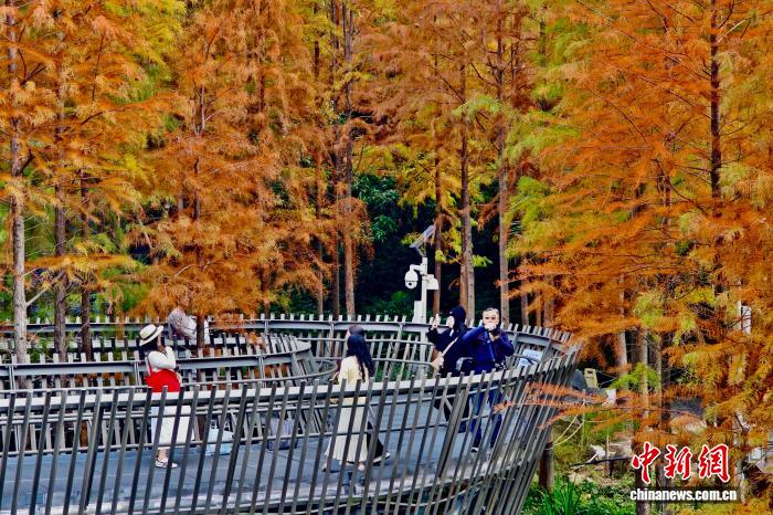 12月22日,福建福州,市民和游客在福道觀賞漸漸“換裝”變紅的水杉林。中新社記者 王東明 攝