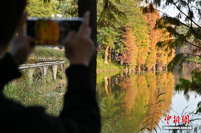 12月27日,廣東省廣州市麓湖公園的落羽杉換上“冬裝”,由綠色轉(zhuǎn)為古銅色或紅褐色,吸引游客游園拍照。中新社記者 陳楚紅 攝