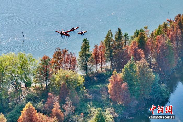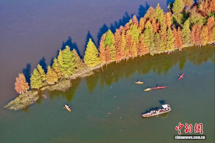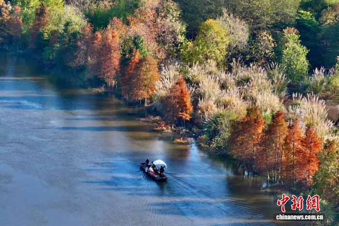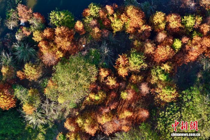 1月7日,福建省福州市閩侯縣濕地公園里的水杉漸漸變紅。福州地處東南沿海,境內(nèi)濕地資源豐富,并在2025年7月被正式授予“國(guó)際濕地城市”稱號(hào)。(無人機(jī)照片)中新社記者 王東明 攝