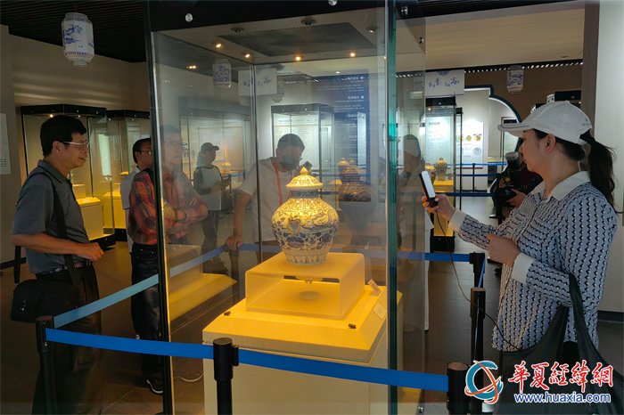 兩岸媒體人在高安元青花博物館拍攝青花云龍紋獸耳蓋罐。(攝影:虞鷹)